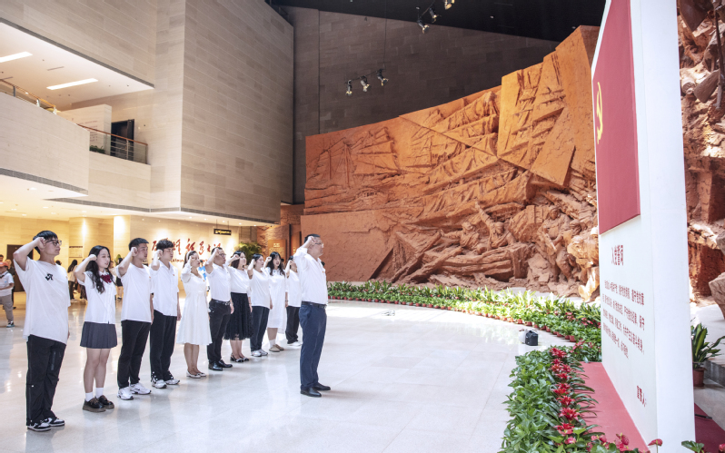 在渡江战役纪念馆前,全体师生肃立,瞻仰五前委雕塑表达深切缅怀和无限敬仰。纪念馆一楼大厅内,全体教师党员和学生预备党员面向鲜红的党旗,高举右手,重温入党誓词,学生入党积极分子驻足观礼。铿锵的誓言,庄严的承诺,是全体师生党员对理想信念的铭记,接续奋斗的昭示。
